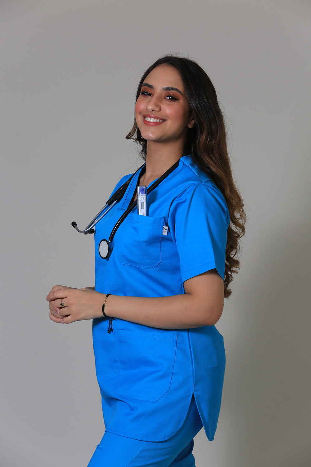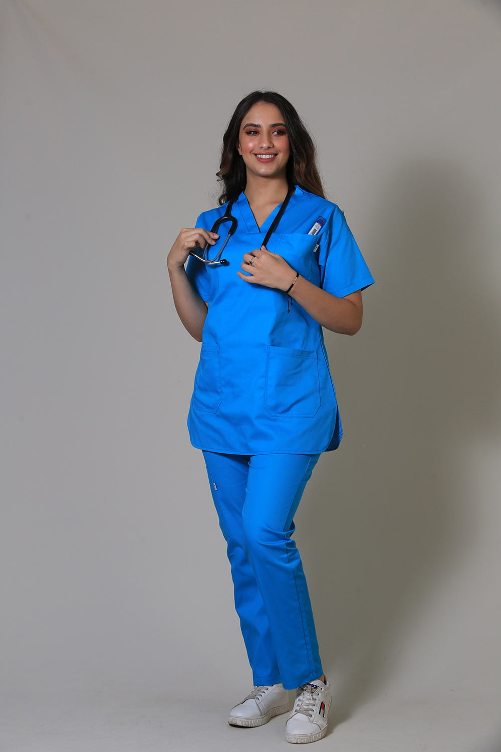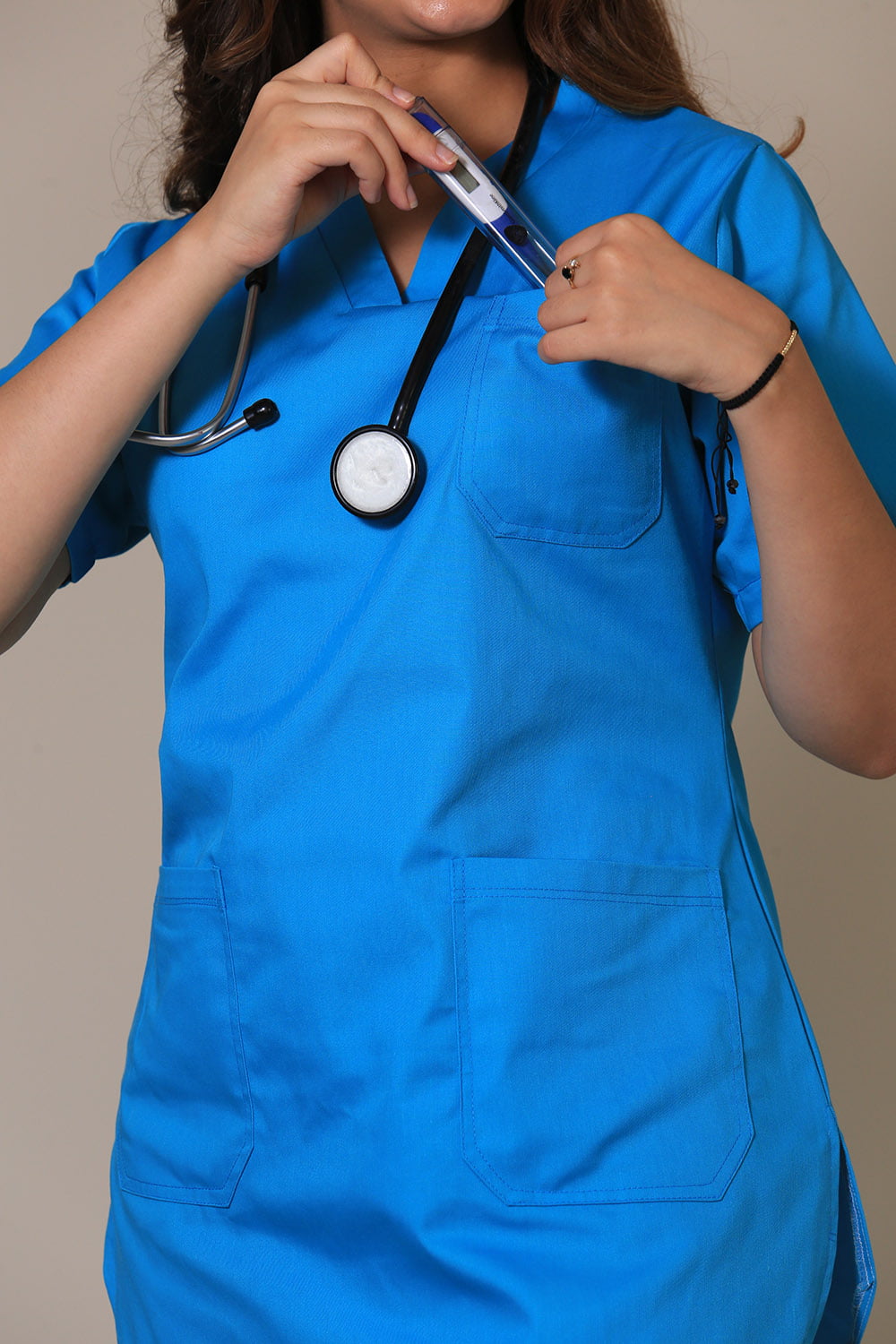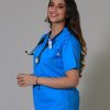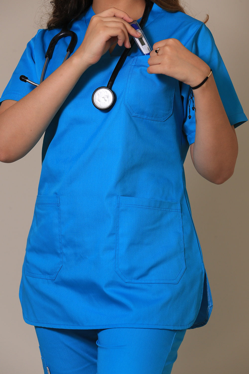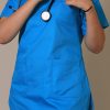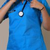 La tunique médicale : à col V, à manches courtes, à 1 poche poitrine et à 2 poches basses.